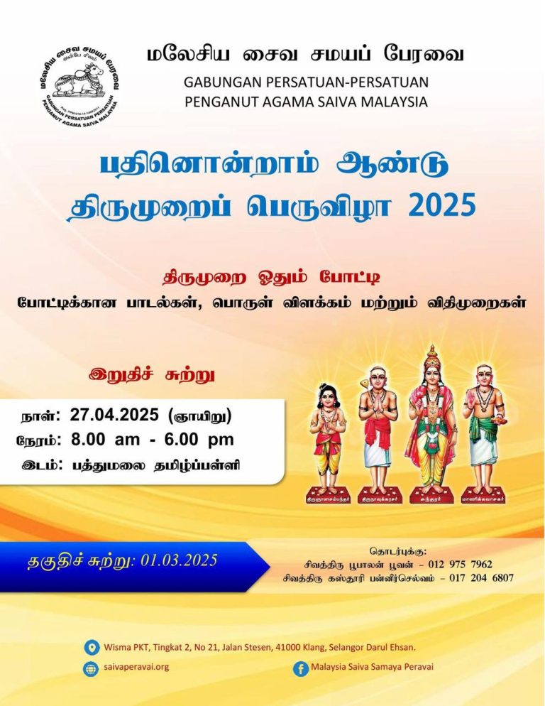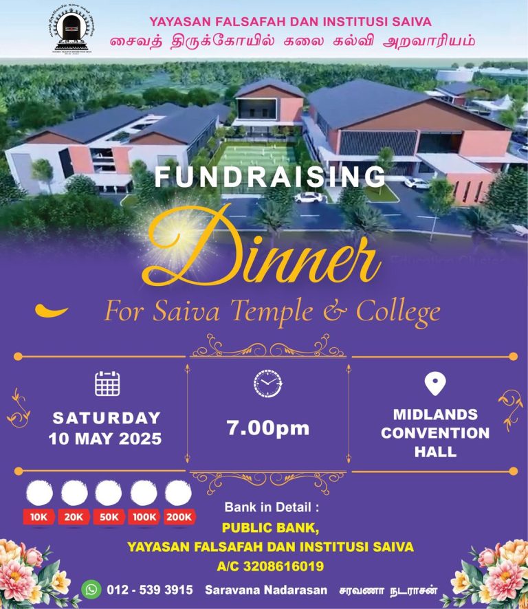 Yayasan Falsafah Dan Institusi Saiva will be organizing a fundraising dinner on May 10th, 2025 at Midlands Convention Centre, Shah Alam. The ultimate goal of this event is to raise RM 2.4 million for the proposed Saiva Temple and College at Kerling, Selangor. We need generous support from saiva students, members of public, corporate companies, NGO’s in realizing this project that would have a positive impact within our Hindu community in Malaysia. You may support this noble cause by buying one of the tables from the below category for this dinner event.